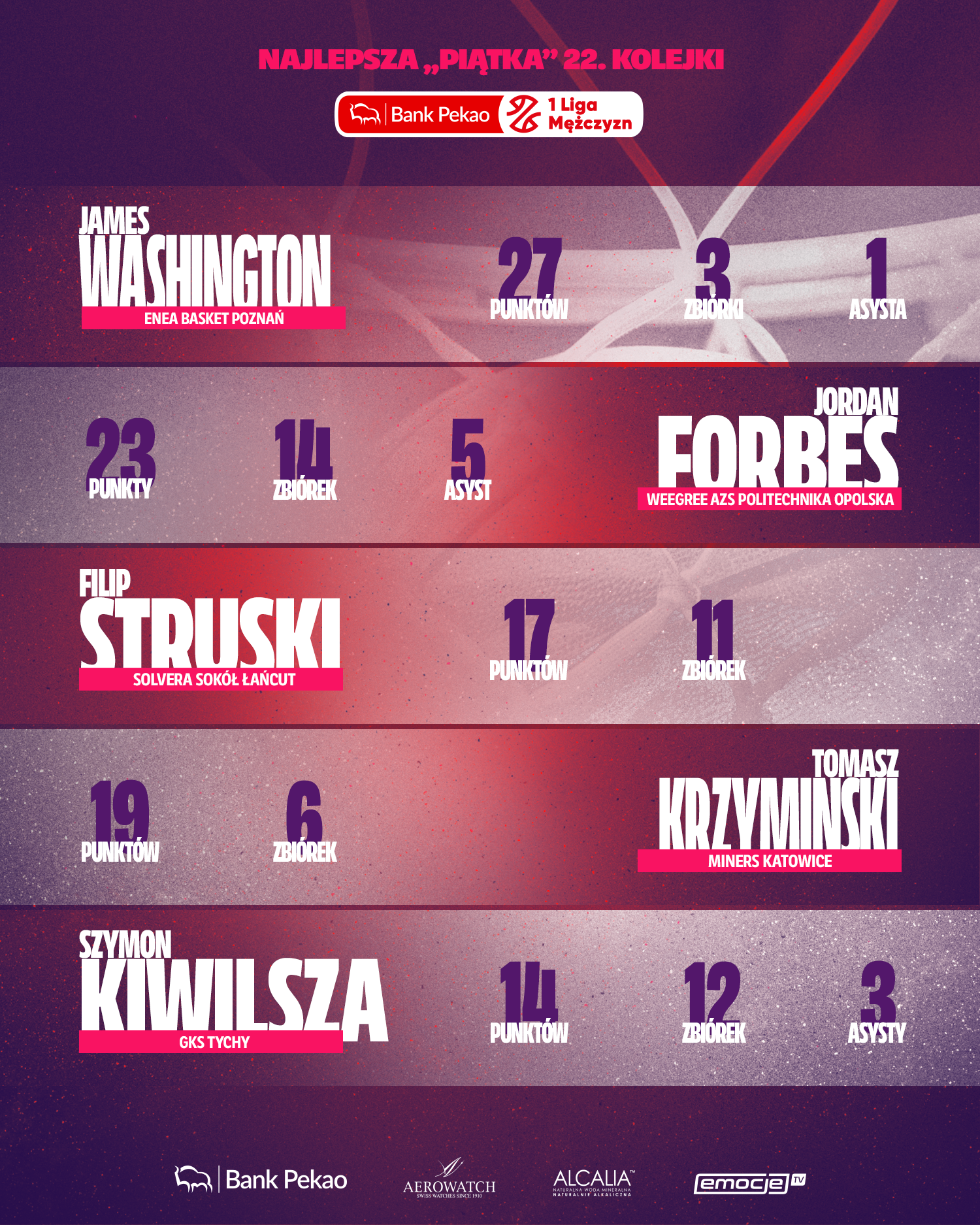 - zgodnie z zasadami gry w Pekao 1 Lidze Mężczyzn, w piątce kolejki znaleźć się może maksymalnie dwóch zawodników zagranicznych